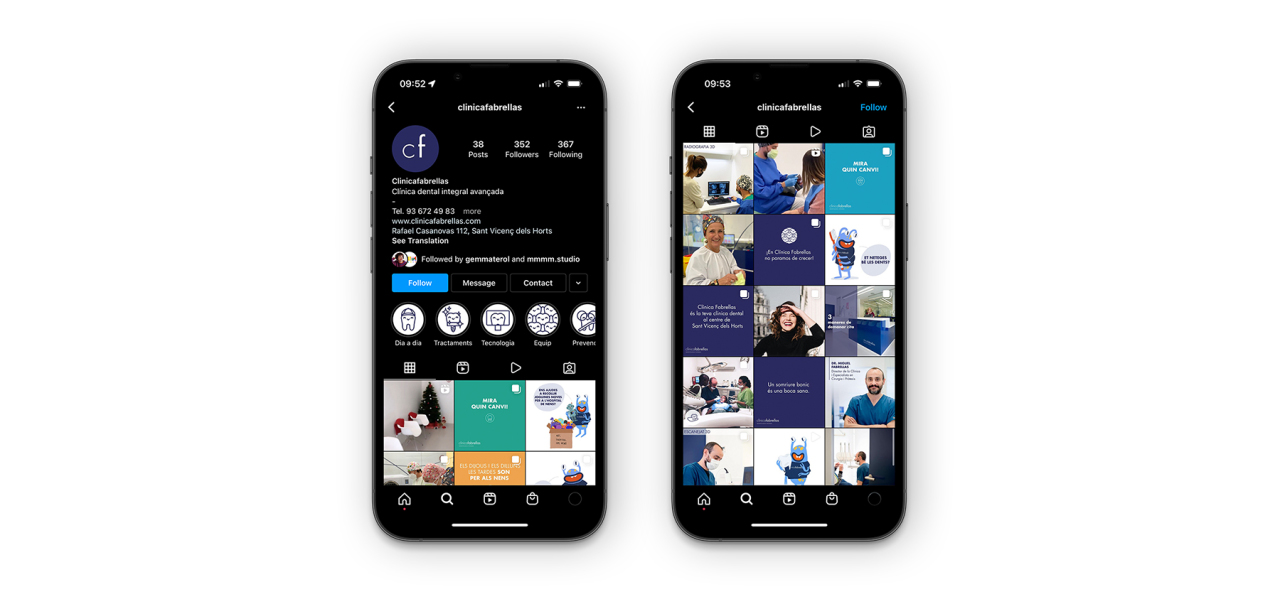 Fabrellas dental clinic, in Sant Vicenç dels Horts, is a friendly clinic, with a social and fun team of professionals. They needed to convey this essence in their social networks, so they commissioned us to design the graphics for their publications.